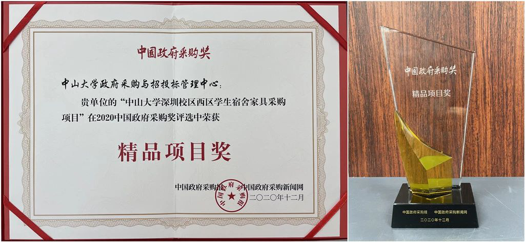 近日,我司受中山大学的委托,代理采购的“中山大学深圳校区西区学生宿舍家具采购项目”在2020中国政府采购奖评选中荣获“精品项目奖”。